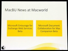 今回説明がなされた「Entourage for Exchange Web Services (Entourage EWS) Beta」と「Microsoft Document Collaboration Companion for Mac Beta」に関する詳しいレポートは、MACお宝鑑定団の「Microsoft 記者会見レポート」を参照して下さい。