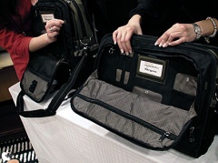 バッグとして、Radiusコンバーティブル for 15" MacBook Pro」と「Radiusメッセンジャー for 15" MacBook Pro」が展示されていて、アクセサリーポケット等には、Macアクセサリーを想像させるアイコンが付いていました。どちらも、iPodのイヤホンを通すための穴が用意されています。