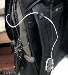 バックパック、ショルダー等でも使用可能なRadiusコンバーティブル for 15" MacBook Proには、バックパック時のショルダーストラップに、iPodのイヤホンを巻き付けるためのイヤホンケーブルホールが装備されていました。