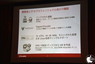 Parallels Desktop for Mac Enterprise Editionは、仮想マシンから、ディスク領域を効率的に使用する「リンクされた複製」が可能になり、CLIおよび構成ファイルを用いて仮想マシンを準備出来る「Vagrant Provider」機能が利用可能になっていると説明した。