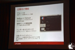 また、仮想マシンを実際のPCとして管理出来る「アセットID」や、日本のユーザーからの要望に応える形で、NetBootやFileVaultにも対応したと説明した。