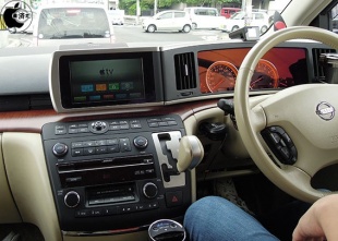エルグランドの後ろにApple TVを置き、iPadのテザリングを利用してWi-Fi環境を構築し、運転席に設置したiPhone 5sとAirPlayでマップを表示させたり、資料確認に役立てていると話してました。