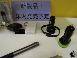 同社は、Lightningアクセサリーを拡充する予定だそうで、キーホルダーにもなるLightningコネクタ搭載バッテリーや、Lightningケーブルを巻き付けて収納出来るカーチャージャーなどが参考展示されていました。