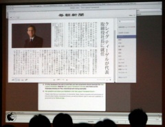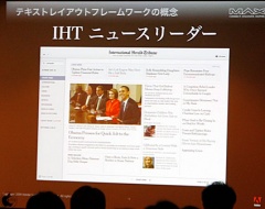アドビシステムズのNat McCully氏はまず、「基調講演でも紹介されたIHTニュースリーダー(ニューヨークタイムス)はAIRアプリケーションで、携帯からもPCからも新聞紙とほぼ同じようにきれいで読みやすいレイアウトを実現しますと説明した。