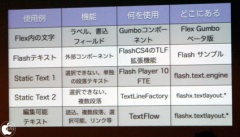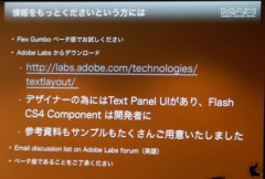 まとめとして、「●Flash Player10のテキストエンジンは大幅に機能アップ ●英語以外の文字を入れるなら TextFieldではなく、FTEとTLFを使いましょう ●デザインのときはFlash cs4のテキストレイアウトパネルで ●Flexでも開発の場合はGumbo componentsを使用 ●奥深いところまで行くならActionScriptのレイアウトのAPIがお友達」とし、情報がもっと欲しい人は、Flex Gumboβ版をお試しくださいと説明してました。