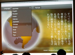 世界の文字を正しく組版できます。タイポグラフィについてのフューチャーはたくさんあり、30個のスクリプトをサポートし、新しくサポートしたものもたくさんあります」と説明し、地球から地図をクリックすることによって、フォントが選ばれた国の言語になる様子をデモ。日本語に切り替えた場合は縦書きとなった。