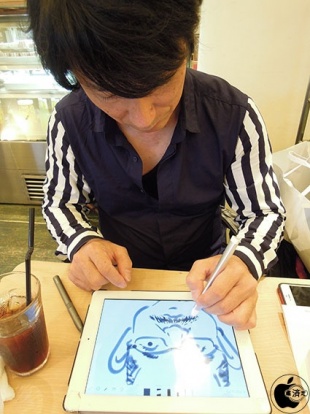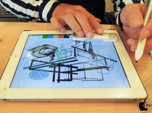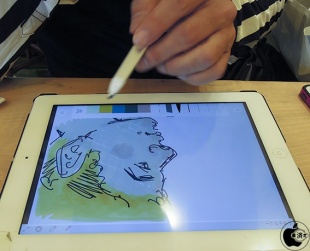 Adobe Photoshop Sketchを使用しながら、イラストレーターの多くは、紙の上に書くので、こうしたiPad上でイラスト制作を行なうと、ガラスの上にボールペンで書いているような感覚になり、紙の引っかかり感が無いので違和感を覚えると思うが、スラスラと筆を走らせて描く方の場合、直ぐに慣れるじゃないかと話していました。