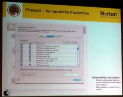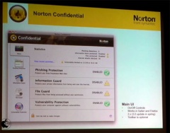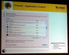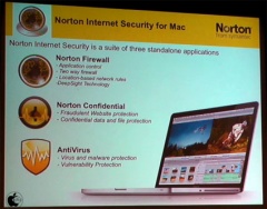 次に新製品紹介となり、ノートン・インターネットセキュリティ for Macはノートンファイアウォール、ノートン・コンフィデンシャル、アンチウィルスの3つの独立したアプリケーションのパッケージソフトであり、アプリケーション制御、ファイアウォール制御、ネットワーク検出、DeepSight技術、個人情報保護といった新機能があると紹介しました。