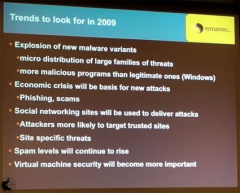 テーマは新製品紹介と最新のオンライン脅威についてということで、前半はウィルスなどの悪意あるソフトとセキュリティソフトを作る側との攻防戦のなかで、悪意あるソフトはどんどん巧妙になり、例えば、実際にあるサイトをまねて作り、そこから必要なプラグインソフトのサイトに誘導。ユーザは必要なプラグインソフトとともにウィルスやマルウェアといった悪意あるソフトをダウンロードしても、1つのファイルになっているので、気がつかずにインストールしてしまう。また、なんとなく安心してしまいがちなSNSを利用したフィッシング詐欺、不況を逆手に取って、得すると思わせるメールを送ってくる等、現在の人々の状況をうまく利用していると語っていました。