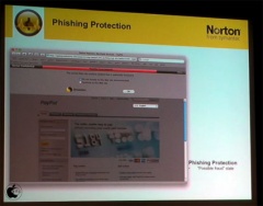 次にフィッシングプロテクションの説明になり、「ノートンコン・フィデンシャル」の中のフィッシング詐欺対策機能です。フッシング詐欺サイト対策は、不正サイトのリストが有効ですが、ユーザが新しい情報をダウンロードするころにはサイトが変わっている場合があるので、ブラックリストには入っていないサイトでもエンジンが問題をみつけ、不正のにおいがあると判断すればユーザにこのサイトにいかないよう警告します。ユーザが既知の詐欺サイト、不正のにおいのあるサイトを訪れた場合は赤いバー、安全が確認されたサイトへ訪れた場合は緑のバーを示します。このようなサイト情報を2時間ごとにアップデートていますが、Macユーザはウィルスソフトに煩わされるのを嫌う傾向があるので、バックグラウンドで更新されるようにしています。」と、Mac版ならではの心遣いがあることも示してました。