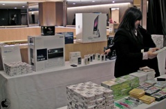 展示会場では、スピードクジ抽選会も行なわれていました。最近の展示会としては珍しく、iMac (Early 2008)、iPod touch (2nd generation)、iPod nano (4th generation) 10個、iPod touch (2nd generation)、AirMac Extremeベースステーション 2個、Apple TV 2個などのアップル製品や、ネットPC、プリンター、デジカメなどいった豪華な景品が用意されていて、外れても、菊水總本店のDiSロゴ入り瓦せんべいや、各メーカーから提供されたノベルティ類がドカっと渡されます。
