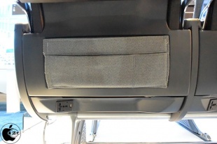 茶色の革製のベルトが付いている部分は伸縮可能なバントとなっており、iPhone などの携帯電話を挟みこんで固定することが可能になっています。このベルトの近くに用意されているのが USB2ポートとHDMIポート、読書灯。USBポートは現行システムの「eX2」では 1A しか供電されませんが、新モデルでは 2.4A 供電となるので iPad の充電も可能になります。