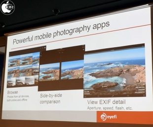 なお、EyeFi Mobi.app は今後増加するであろうハイアマチュア・プロの利用にも堪えられるようにプレビュー機能を拡張し、複数画像のプレビュー表示の高速化、2枚の写真を比較してのセレクト、縮小リサイズ転送された画像でも Exif データを容易に確認できるような表示機能などをサポートしています。