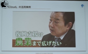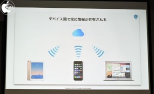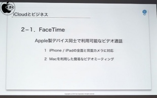 最初に「iCloud」についての説明があり、iCloudは同じApple IDでログインしているデバイス間で情報が共有されるサービスで、これをビジネス利用する方法についての紹介が行なわれました。