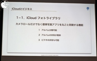 データの受け渡しとして「iCloudフォトライブラリ」を紹介し、アルバムの分類が可能で、アルバムやビデオの共有も可能だと紹介していました。