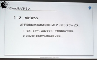 次に「AirDrop」を紹介し、iOS 8とOS X Yosemite以降の環境で、9メートルの範囲の中であれば、iPhone/iPad/Macとの間で、簡単にファイルのやりとりが可能だと紹介していました。