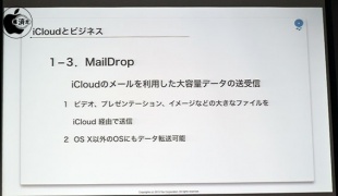 最後にOS X Yosemiteの「Mail Drop」を紹介し、送る側、受け取る側の両方がiCloudにログインしていることが条件とし、iCloudのメールを利用して、iCloud上からダウンロードすることが可能だと紹介していました。