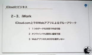 現在、ベータ提供されている「iWork for iCloud」は、iCloud.com上でのWebアプリによるグループワークが可能で、1つのデータを共同で作成したり、オフラインでも個別編集が可能だと紹介していました。