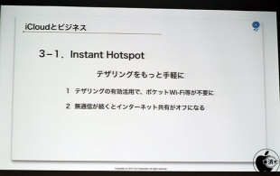モバイルワークサポート機能として「Instant Hotspot」を利用することで、簡単にテザリングを利用することが可能だと紹介していました。