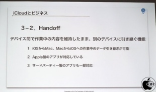次に「Handoff」は、デバイス間で作業中の内容を維持したまま、別のデバイスに引き継ぐ機能だと紹介していました。