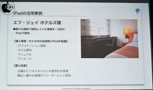 iPad導入事例として、エフ・ジェイ・ホテルズに、ホテルの各部屋にiPadを配備した導入事例を紹介していました。