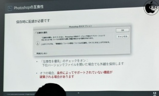 Adobe Photoshopの互換性に関して、Photoshop 形式オプションを選択しても外観を保持する機能があるが、最近は、必ずしも外観が保持されない場合があると説明していました。