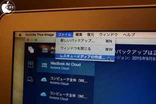 OS X において初期状態からバックアップを用いて復元する方法としては、Acronis True Image にはOS X のコアと共にAcronis True Image を入れた専用起動USBメモリ「レスキューメディア」を作成するためのメニューが存在するので、事前にレスキューメディアUSBメモリを作成の上で、そのメモリを利用して起動、復元して欲しいということでした。