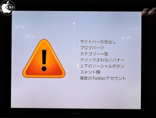 基本的に、人は複雑なものは見ない傾向があり、サイドバーの見出し、ブログパーツ、カテゴリー一覧、クリックされないバナー、上下のソーシャルボタン、コメント欄、複数のTwitterアカウントなどは必要無いと思うと話し、ばっさり落とすと良いと説明してました。