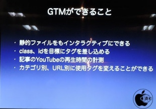 また、静的ファイルもインタラクティブにすることが可能で、class、idを目標にタグを差し込め、記事のYouTubeの再生時間の計測、カテゴリ別、URL別に使用タグを考えることができるそうで、SEO対策としてもかなり有効だと話してました。