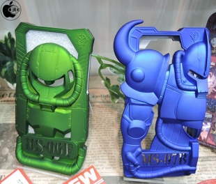 iPhone6s/6対応の側面及び背面の一部を守るプラスチック製の保護カバー「機動戦士ガンダム iPhone6s/6対応 スケルトンカバー」の新作として、ザクIIの「MS-06F」と、グフと呼ばれる「MS-07B」が追加されるといて展示されていました。