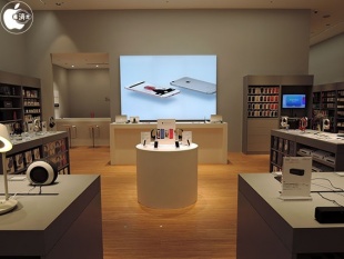 壁面には、最近のApple Retail Store同様に、シルクスクリーンを使った壁面バナーが設置されています。