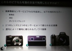 そして、「過去とはちがった方法で処理をするカメラがすでにできてきている。」と、最高の解像度を使うか解像度を犠牲にして別の情報(輝度もしくはダイナミックレンジ)をとるかを選べる「スーパーCCDハニカムEXR」(富士フィルム)、2つのレンズと2つのセンサーによって、立体的に画像を撮ることができる「FinePix Real 3D System」(富士フィルム)、シャッターを押したままカメラを動かすことによってパノラマ写真を撮ることができる「Cyber-shot DSC-HX1」(SONY)を紹介。