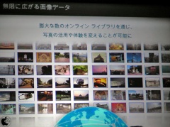 と今まさにカメラにおける転換期であることを語り、MIT大学と共同で開発中のテクノロジー「infinite image」(無限のイメージ)を、実際には関連のない画像をシームレスに繋げて無限のパノラマをつくっていくものと紹介。ビデオを使ってズームインすると継続的に新しい画像が投入され永久につづく様子をみせた。