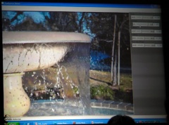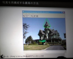 「このレンズでとった画像はいっけんデコデコしたガラスの先に何かがみえているようだが、ズームインしてみると少しづつ違う角度で撮った非常に小さなイメージがたくさん組み合わさり、多くの情報を集めている。これにより、撮影した後にコンピュータ上で焦点,視点を変えるといった編集が行え、最終的な写真を生成することができる。さらに3Dの深度の情報をもとに噴水を自動的にとりはずすというようなマスキングができるようになるかもしれません。このテクノロジーは出来るだけ多くの情報を収集し、合成をして仕上げていきます。合成して新しい写真をつくっていくテクノロジーにはシームカービングもあります。画像の中で重要な部分とそうでない部分を認識し、画像に影響の少ない部分だけを縮小・拡大します。Photoshopではコンテンツ認識型の拡大縮小と呼びCS4に搭載しています。」と話した。