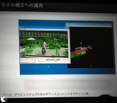 また、ビデオデータの手ぶれ補正にも適用しており、手ぶれをうまく整列させるサードパーティも出ているが、完全にはできません。そこで、Adobeではビデオの中で重要である中心の人物に焦点を置き、それ以外のところでひずみを発生させるというアプローチをとっています。背景に発生するひずみは非常に小さなものなので、ビデオを見てもきづきません。
