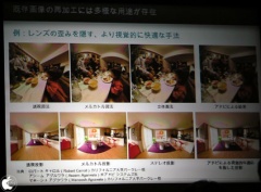 さらに、現在、広角レンズによって発生するゆがみ・ひずみを、視覚的に重要でない部分(テーブルクロスや天井など)に集約することにより100%正確な画像でなくとも視覚的に快適な写真になるテクノロジーを開発中だと話した。
