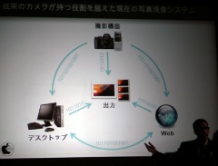 そして、Web側でも今まで以上に編集が可能になり(参照:https://www.photoshop.com)、Webにアップすれば人からのコメント、キーワード,キャプションを活用することができます。また、異なる画像同士の相関性も取得することができます。これらのどの過程であっても、情報の収集・処理がされるというのが今までとは非常に異なる点です。また、画像処理の概念も、従来であればフィルムを現像して仕上げていくことをさしたが、いまは殆どの処理がカメラおよびプリンタの中でおこなわれ、画像処理というと合成させる・色調整する・編集する・クリエイティブにしていくことを表します。」