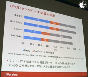 シャドーITで高い潜在リスクを抱えて情報流出などに脅えるぐらいであれば、使いやすくも管理された 仮想デスクトップ環境を きちんと整備することで安定、安全な情報管理を実現できるように Parallels社は Remote Application Server などを通じて提案してゆきたいという事でした。