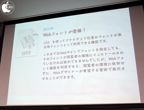 2010年に「Webフォント」が登場し、CSSを使ってブラウザ上で任意のフォントが表示用フォントとして利用出来るようになったと説明し、ほぼ日刊イトイ新聞「吉本隆明の183講演」を事例として紹介していました。