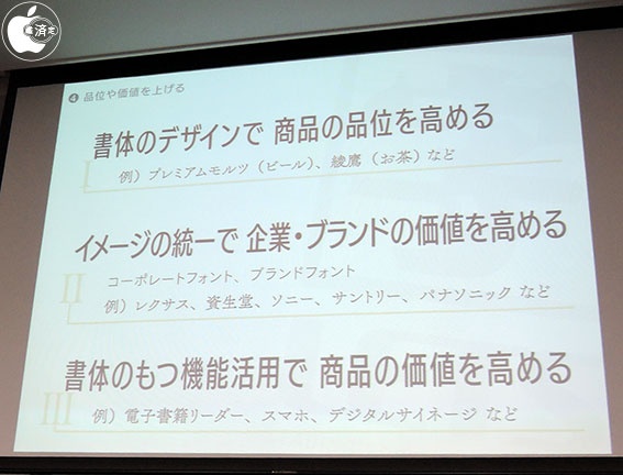 品位や価値を上げる例として、書体のデザインで商品の品位を高めたり、イメージの統一で、企業・ブランドの価値を高めたり、書体のもつ機能活用で、商品の価値を高めたりすることが出来ると紹介してました。