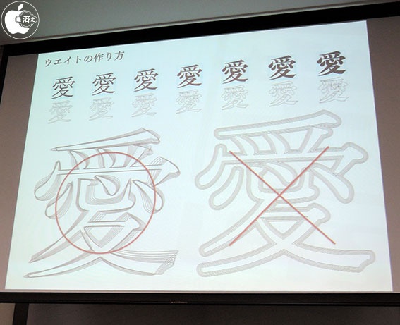 フォントには、同じ書体でも太さの展開がると紹介し、ウェイトの作り方は、縁を太らせてるわけではなく、それぞれの太さを見極めながらデザインを変えていると説明しました。