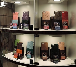 ポロサスクロコを使用したT・MBH製造の「GRAMAS Meister Crocodile Case MI8014 for iPhone 6s / iPhone 6」などで使用されるスモールスケールクロコ革が展示されていました。