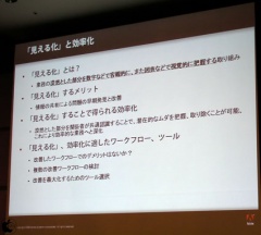 日下部氏は、業務の漠然とした部分を数字なので客観的に、また図表なので視覚的に把握する取り組み「見える化」について説明し、効率化に適したワークフローとツールを用いることで、作業効率の改善が見込まれると説明していました。
