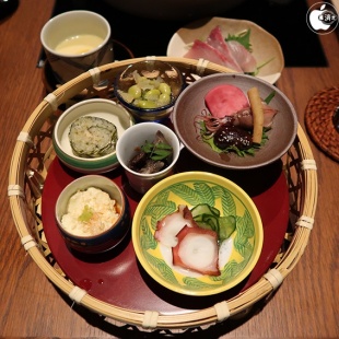 最初に、箸染めの茶碗蒸し、本日のお造り、数の子豆・豚ハツ艶煮・穴子中巻き・味噌漬け牛旁・クリームチーズ豆腐などが籠盛りされた八寸などが出てきます。