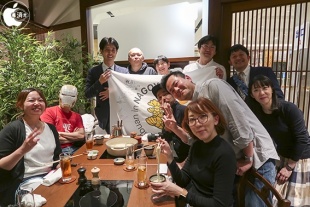 HappyPrintersの堀江さんが、豚組しゃぶ庵 名古屋のキャラクターマークである金のシャチホコをあしらった横断幕を勝手に作ってもってきていたので、みんなでオープン記念寄せ書きをして、29号@オジ旅さんに贈呈されました。