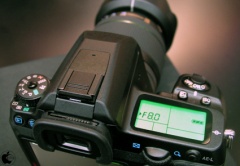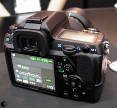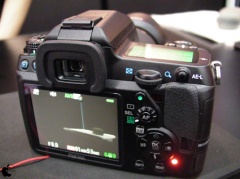 背面の操作系は、K-20Dと比べ、液晶面左側にあったメニュー/削除/Info/再生ボタン類の位置が変わり、再生/削除ボタンがファインダー左に、info/メニューボタンが右下に移動しています。