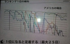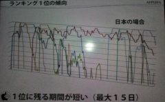 それに対し、アメリカのApp Storeだと1位の滞在期間が長く、最大25日で、その後定番化すると説明していました。
