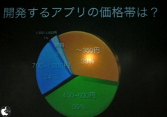 iPhoneで魅力的なものという質問に関しては、市場規模の大きさ、アプリ購入の手軽さ、価格設定の自由度、マルチタッチで直感的だとの回答が多くあり、アプリの価格帯については、0〜350円が33%、450〜600円が39%、700〜1200円が24%という結果になり、iPhoneアプリでプレミアム価格といわれる価格帯を狙っているメーカーが結構多いことが見てとれると紹介した。