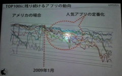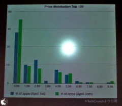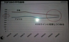 また、価格については、最近の傾向として、Top 100位のアプリは、350円ラインに収束しつつあると説明