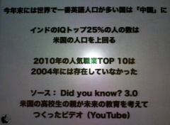 今年の末には、世界で一番英語が話せる人口が多い国は「中国」になるようで、また、インドのIQトップ25%の人の数は、米国の人口を上回っている状況にあり、世界は急速に変わりつつあることを知る必要があると説明しました。